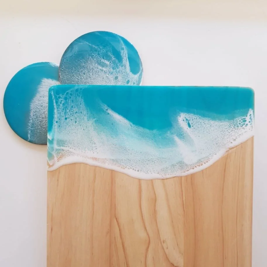 When putting your resin on the board/coasters, make sure all colours are mixed and nearby as the resin will begin curing in about 40-50 mins making it harder to manipulate.